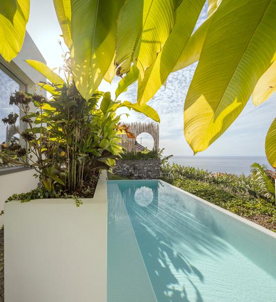 In one of the valleys next to the village, you’ll find two properties that stand out in the landscape thanks to the elegance of its architectural lines in harmony with the surrounding minimalism and tropical setting, which these fabulous holiday homes located in Ponta do Sol owe their personality to.