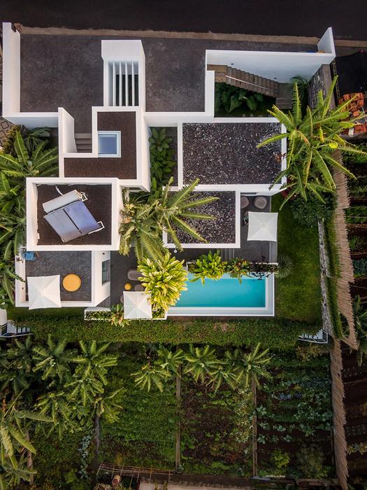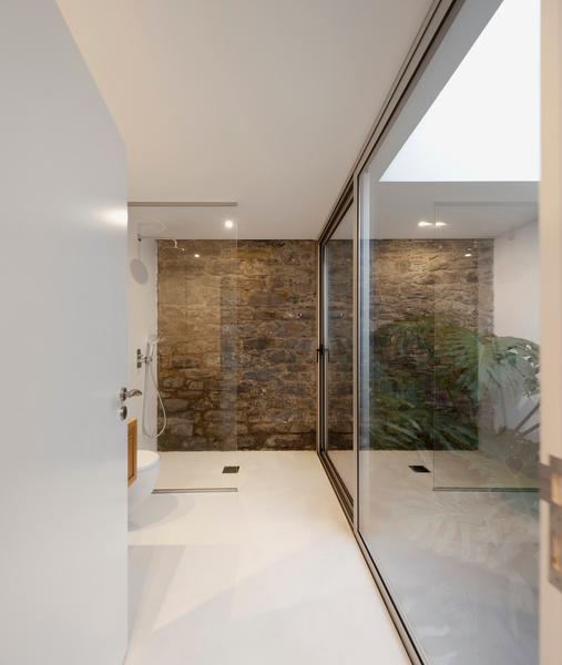 From the other side of the valley the building shows as a collection of smaller volumes, fitting to the area. On the interior the rooms follow the natural inclination of the terrain, allowing the spaces to have a direct connection to the gardens and patios which have different levels of privacy, solar exposure, and shade. The two houses have a shared pool surrounded by lush vegetation, giving maximum privacy towards the terraces. Each house has a private exterior bathtub. The materials chosen are mostly traditional, natural materials like wooden floors, exposed stone facades for the renovated storages and terraces finished with “calçada portuguesa”, a traditional style pavement using small basalt stones