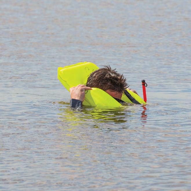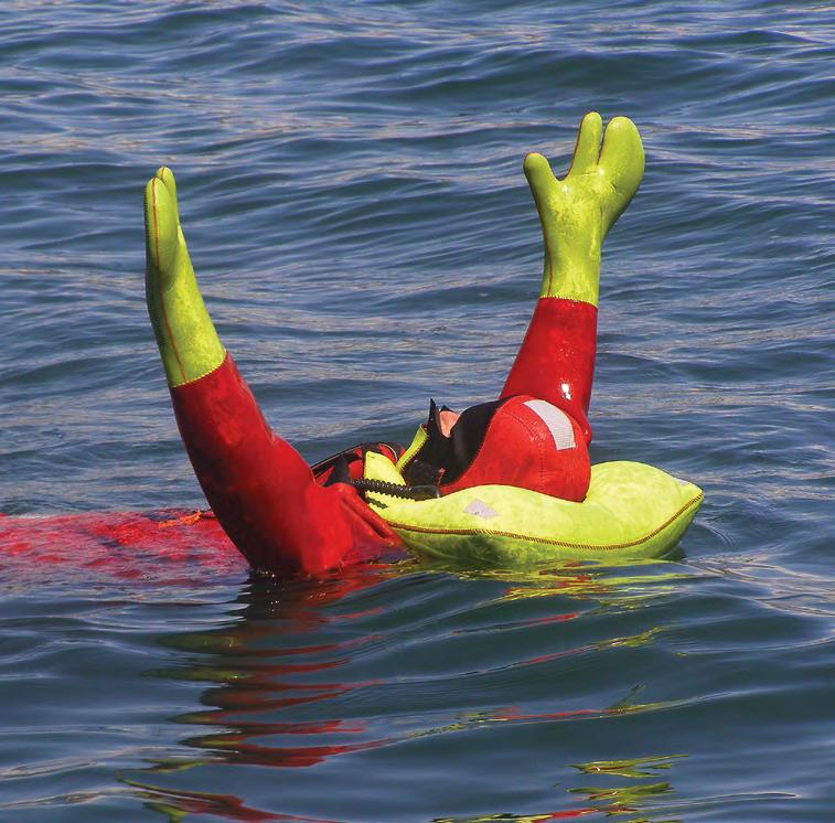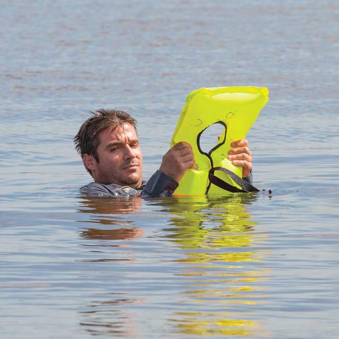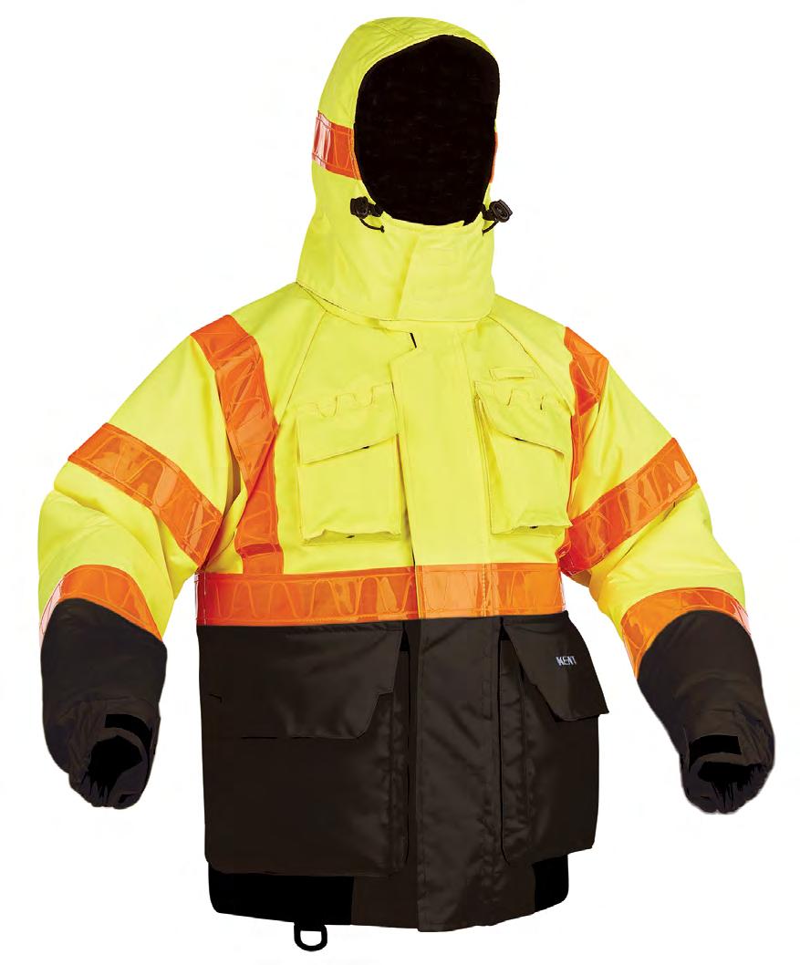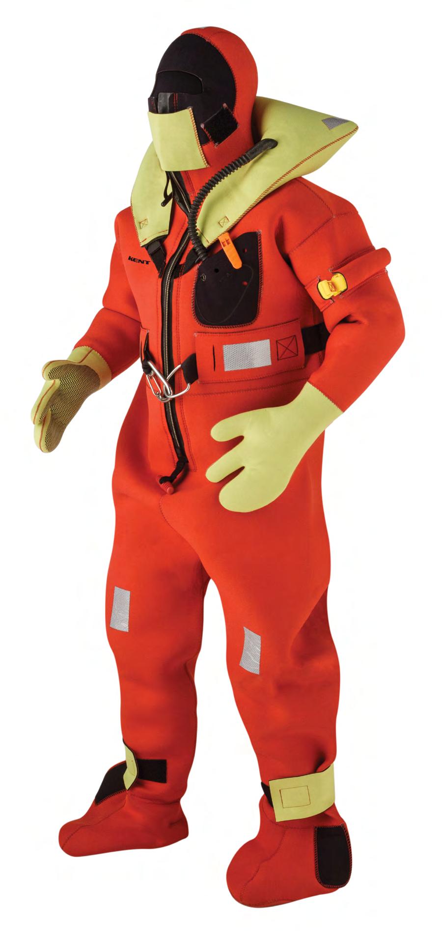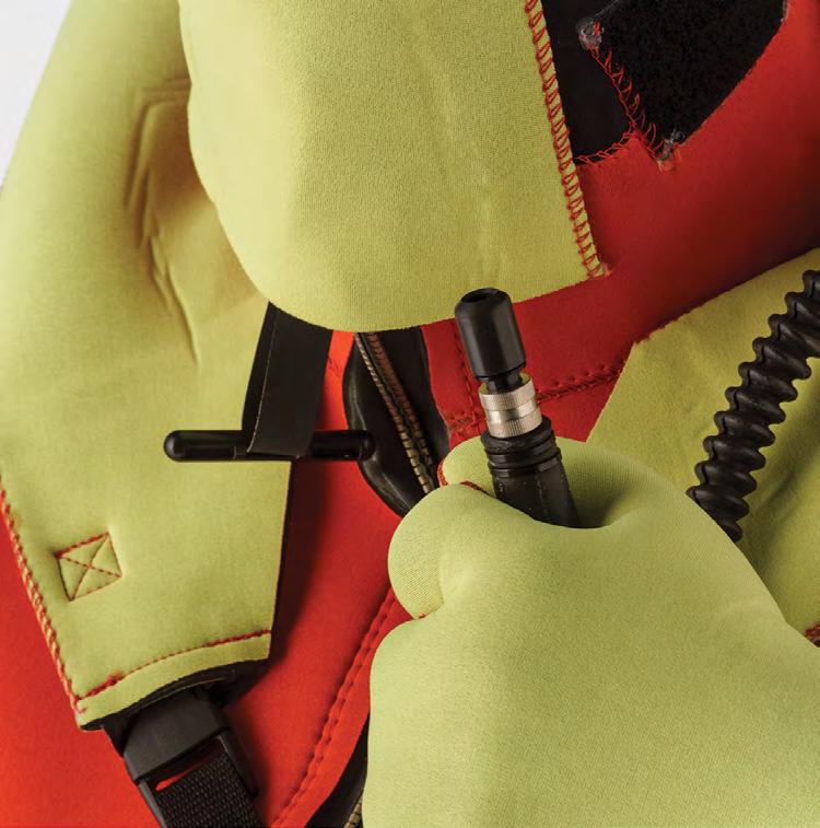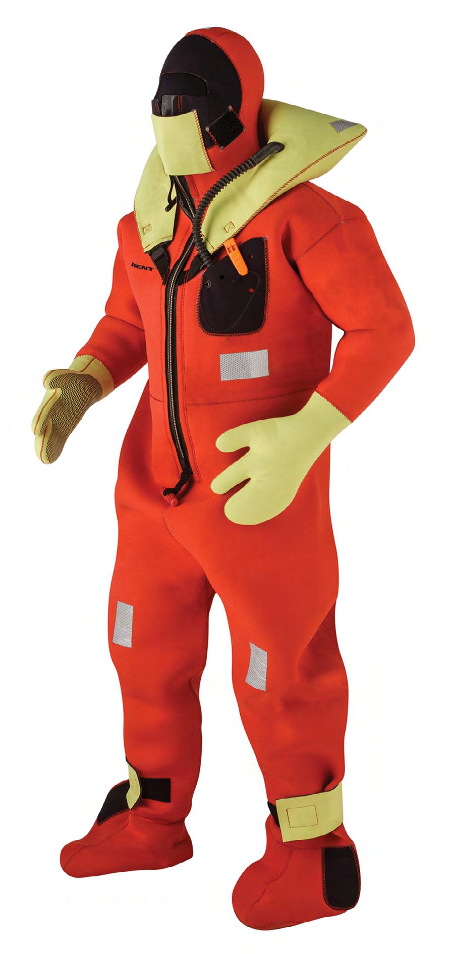 • Hi-vis yellow inflatable head pillow, face mask, mitts, and ankle adjustments for increased visibility in the water