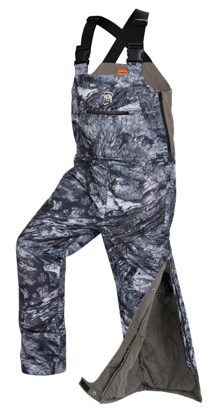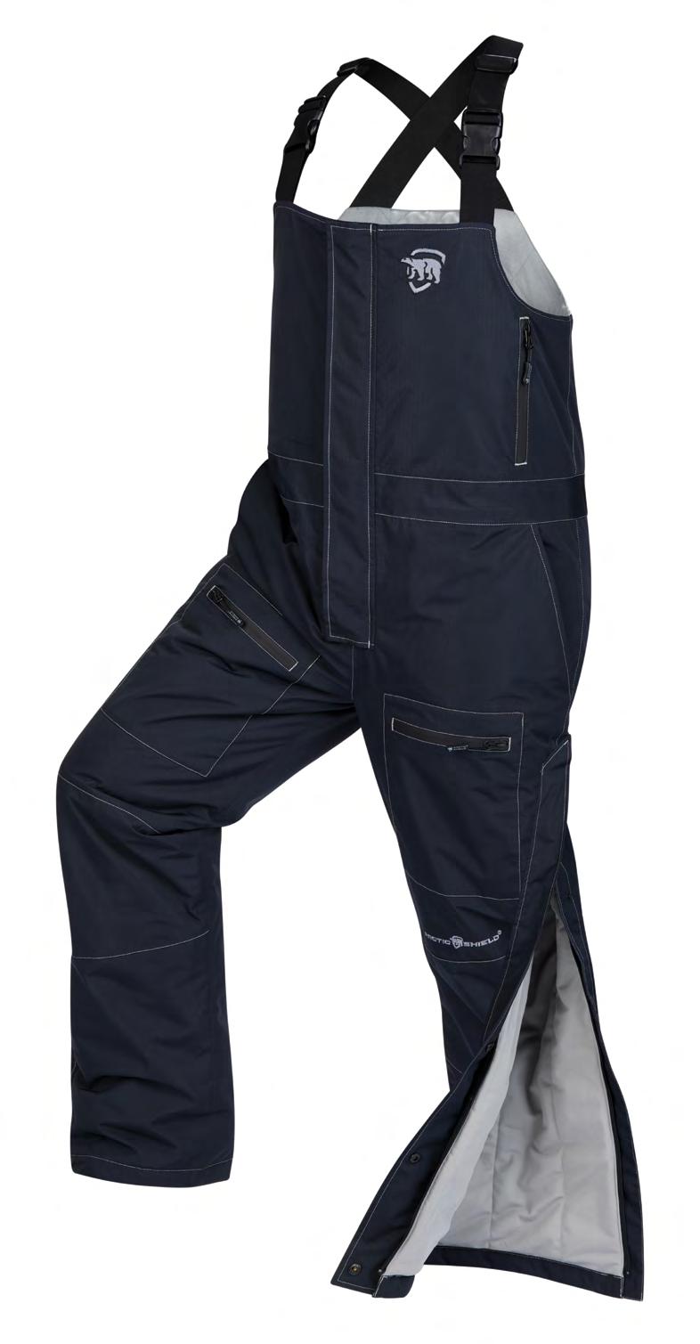 • Hip-high two-way leg zippers with storm flap with snap closure
