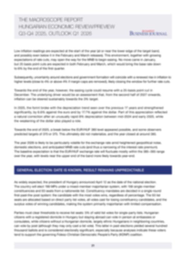 The National Bank of Hungary (MNB) held its key policy rate steady at 6.5% throughout 2025 and in its first rate setters’ meeting in January 2026. A gradual easing cycle is anticipated in 2026, with the base rate falling to around 5.75% by the year-end. Following last year’s strong forint appreciation, the exchange rate is expected to stabilize in 2026, fluctuating between HUF 385–395 per euro.