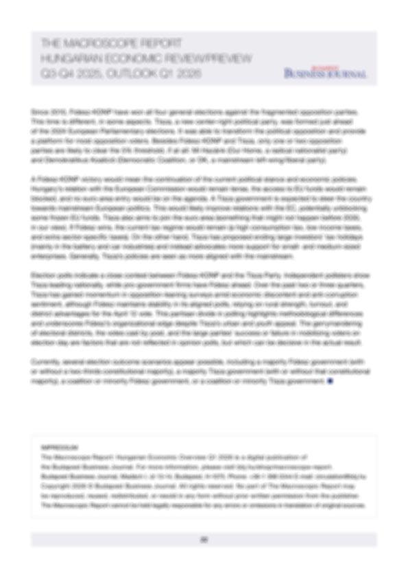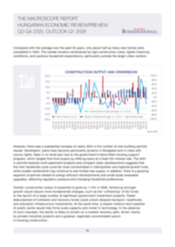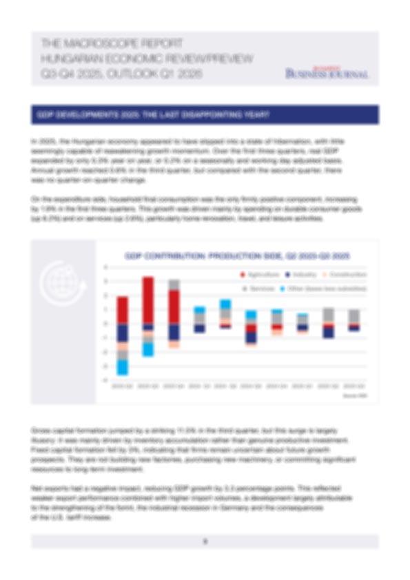 In the first three quarters of 2025, the Hungarian economy recorded only 0.3% GDP growth over the same period in 2024. Economic performance was supported primarily by household consumption (up 1.9%), while investments contracted; net exports made a negative contribution. On the production side, growth in services (+1.5%) offset declines in industry (-1.7%) and agriculture (-6.2%). With no dramatic improvement in Q4, 2025, full-year GDP growth was probably 0.4%. In 2026, GDP is projected to increase by around 1.8%, driven by accelerating private consumption growth supported by pre-election fiscal transfers and modest improvements in industrial and investment activity.