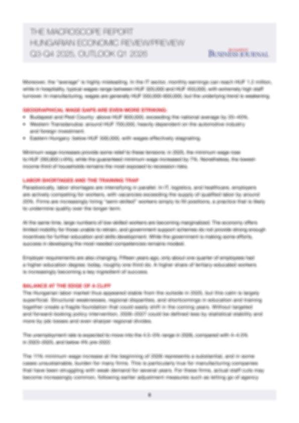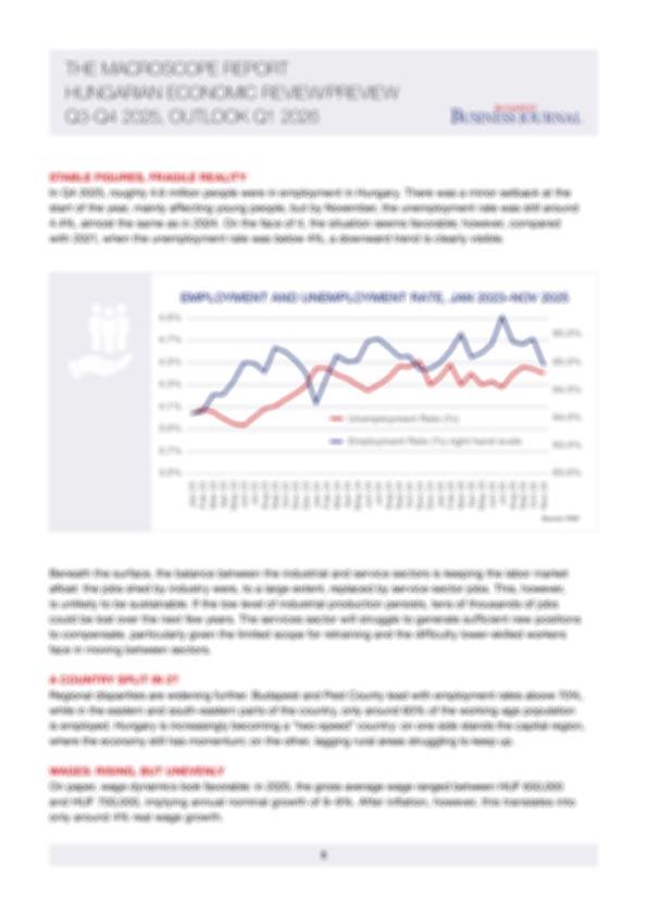 The labor market appeared stable in 2025, though structural pressures have begun to emerge. Total employment stagnated at 4.6 million, while the unemployment rate averaged 4.4%, masking widening regional disparities. Budapest and Western Transdanubia continued to show near-full employment, whereas Eastern Hungary lagged. Nominal wages rose by 9%, equivalent to approximately 4.5% in real terms, with significant sectoral and regional inequalities.