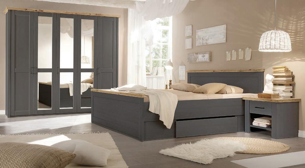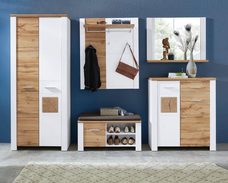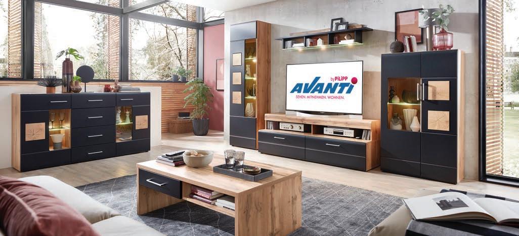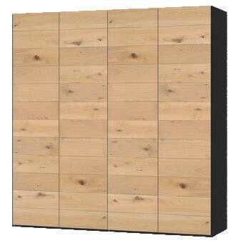 Wohn-Programm, Artisan Eiche MDF, Absetzung graphit Dekor. Ohne Deko. 11200050/00-05 1 Sideboard, ca. 165x82x44 cm. 339.2 Highboard, ca. 145x127x38 cm. 429.- 3 Vitrine, ca. 75x197x38 cm. 359.- 4 Wandpaneel, ca. 202x93x26 cm, inkl. Beleuchtung.