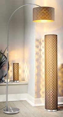 Leuchten-Serie, Metall/Stoff, graubraun/goldfarbig. Sofern nicht anders angegeben: Leuchtmittel austauschbar. 13500222/00-05 LED-Deckenleuchte, Ø: ca. 50 cm, H 12 cm, dimmbar mit Memory-Funktion, 40W, 2500 Lumen, 3000k, inkl. LED-Leuchtmittel, LED nicht tauschbar. 99.99 Pendelleuchte, 4-flg., Ø: ca. 16 cm, B/H ca. 94/150 cm, 4x E27, 60W, exkl. Leuchtmittel. 74.99 Tischleuchte, Ø: ca. 12 cm, H 35 cm, 1x E14, 40W, exkl. Leuchtmittel. 19.99 Stehleuchte, Ø: ca. 20 cm, H 110 cm, 2x E14, 40W, exkl. Leuchtmittel. 54.99 Bogenleuchte, Ø: ca. 35 cm, H 141–192 cm, Fuß Ø: ca. 30 cm, 1x E27, 60W, exkl. Leuchtmittel. 89.99