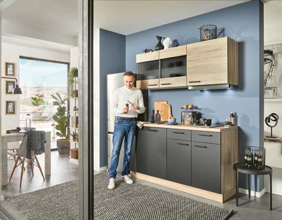 Diese Küchenzeile ist beeindruckend. Auf drei Metern Länge vereint sie alles, was eine Küche unschlagbar macht: Ein großer Kühlschrank, großzügige Ablageflächen auf dem Highboard und ausreichend Platz zum Arbeiten. Die Glasvitrinen mit schwarzem Glas verleihen diesem Küchenmodell ein futuristisches Erscheinungsbild. Die Farbkombination aus Anthrazit und Betonsteinweiß sorgt für ein zeitloses Design, das sowohl zum Landhausstil als auch zur Loft-Ästhetik passt.