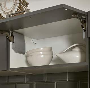 Die Klappschaniere an den schmalen Hängeschränken ermöglichen eine problemlose Handhabung.