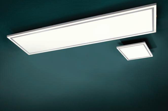 „STAMP“ Metall, Aluminium/Silikon, weiß/ schwarz, B/H/T 65/7/56 cm, 55W, 2200lm, 6000k, dimmbar mit Anpassung der Farbtemperatur, Memoryfunktion. 13500385/00 LED-Deckenleuchte „STAIRS“ Metall, Kunststoff, weiß, B/H/T 53/6/53 cm, 50W, 3750lm, mit Nachtlichtfunktion, Einstellzeit per Fernbedienung. Beide Modelle inkl. Fernbedienung und LEDLeuchtmittel, LED nicht tauschbar. 13500039/04