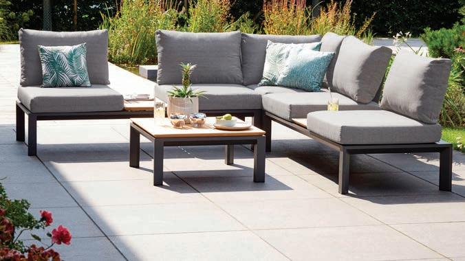 Garten-Set, 4-tlg., Alu-Gestell anthrazit, Teakholzplatten natur, best. aus: 2x 2-Sitzer-Sofa, ca. 175x78x75 cm, Eckteil, ca. 75x78x75 cm und Tisch, ca. 75x30x75 cm. Inkl. Kissen grau. Ohne Deko und Dekokissen. 13500256/00