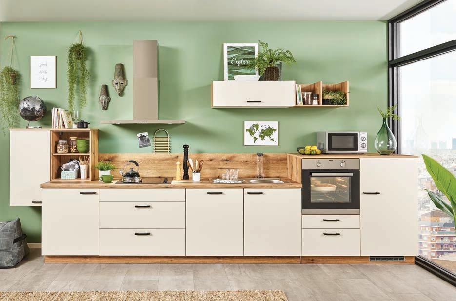 Küchenzeile, Front Magnolienweiß, Korpus und Arbeitsplatte Evoke Eiche Nachbildung, B:ca. 435 cm. Inkl. Edelstahlspüle ZS86E. Ohne Zubehör und Deko.