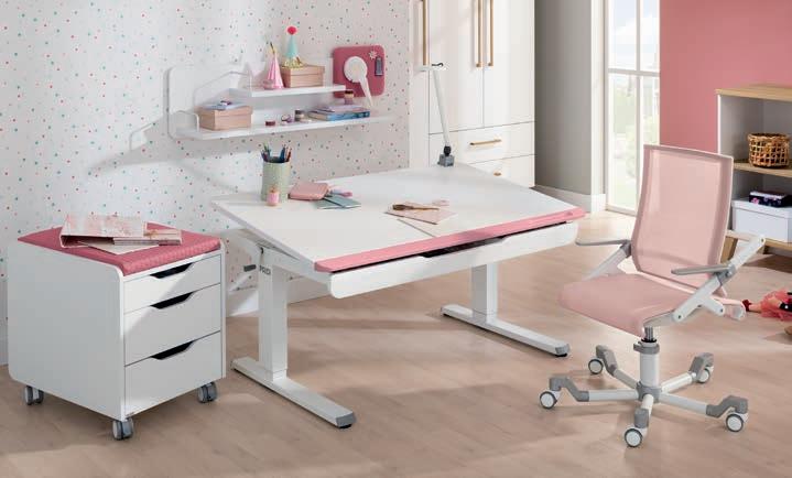 Schreibtisch, kreideweiß/rosé, B: ca. 120 cm, mit Schubkastenauszug. Ohne Leuchte, Pinnboard und Rollcontainer. Drehstuhl 379.-