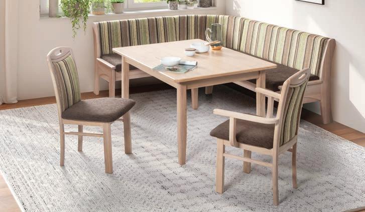 Eckbankgruppe, Wildeiche Bianco furniert/ lackiert, Bezug Cora uni/gestreift mit Schaumstoffpolsterung. 25060011/99 Eckbank mit Truhe, Schenkelmaß ca. 158x198 cm. 2275.- Esstisch, Wildeiche Bianco teilmassiv, ca. 90x130 cm. 875.- Stuhl, Gestell Eiche massiv. 375.- Armlehnstuhl, Gestell Eiche massiv. 475.-