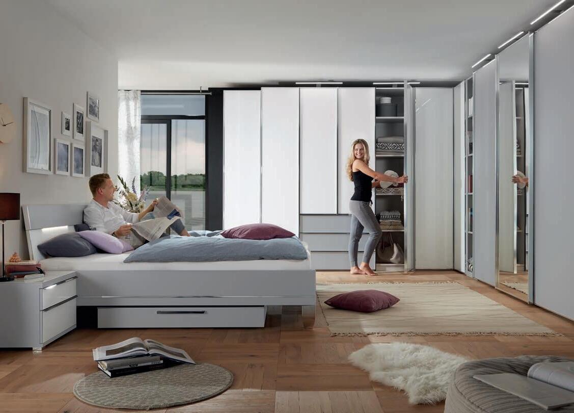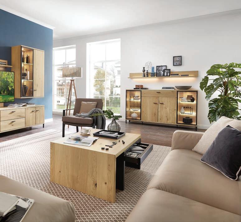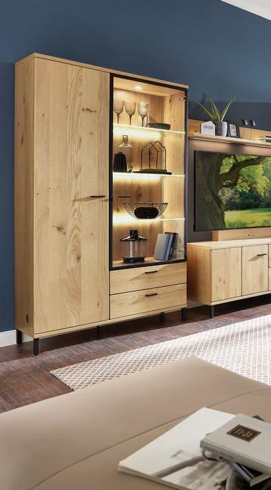 Hinter den Fronten versteckt sich jede Menge Stauraum. Auch für die ordnungsgemäße Unterbringung der TV- und HifiGeräte ist gesorgt. Beleuchtete Vitrinenelemente bieten eine attraktive Bühne für persönliche Sammlerstücke. Preisgleich erhältlich in 7 Front- und 5 Korpusausführungen.