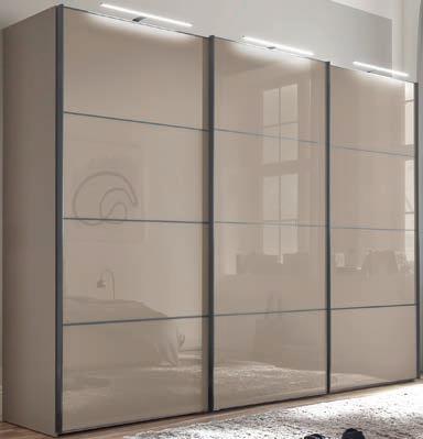 Schwebetürenschrank, 3-türig, Türen Glas Champagner, ca. 300x217x67 cm. 1775.- Passepartout mit LED-Beleuchtung. 599.-