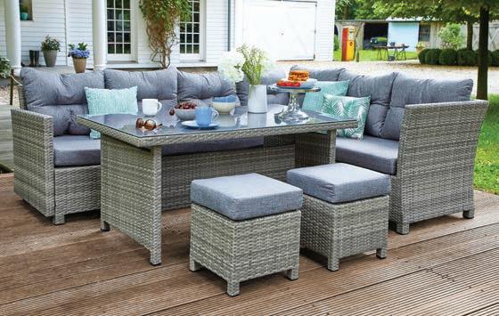 Garten-Set, 5-tlg., Alu-Gestell, Kunststoffgeflecht grau, Glasplatte 5 mm. Inkl. Kissen. Bestehend aus: 2- und 3-Sitzer, Stellmaß gesamt ca. 245x205 cm, 2 Hocker, ca. 40x40x40 cm und Tisch, ca. 145x68x85 cm. Auch spiegelverkehrt montierbar. Ohne Deko und Dekokissen. 13500995/00