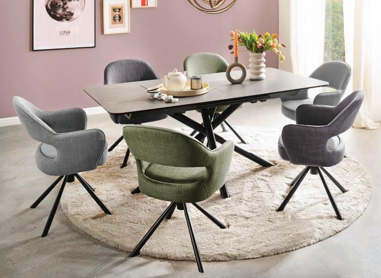 Essplatzgruppe 10050349/00 Esstisch, Metallgestell schwarz matt, Platte Glaskeramik, Einlegeplatte mit Liftfunktion, ca. 180/240x76x95 cm. 1175.- Stuhl, Bezug Stoff anthrazit, dunkelgrau oder olive, Gestell schwarz matt. je 275.-