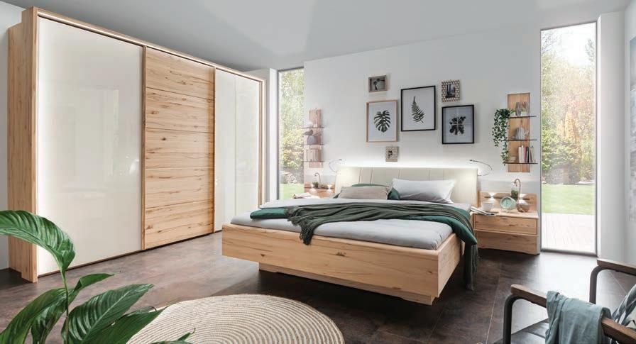Schlafzimmerprogramm, Astkernbuche teilmassiv. Ohne Wandpaneel, Deko und Beleuchtung. 01240069/99 Nachtkonsolen, 2er-Set, schwebend, Front massiv, ca. 60x48x43 cm. Ohne Paneel und Beleuchtung. 475.Doppelbett, Kopfteil Kunstleder Champagner, Liegefläche ca. 180x200 cm. Ohne Beleuchtung, Rahmen und Matratze. 799.Attraktive Inneneinrichtung gegen Mehrpreis erhältlich