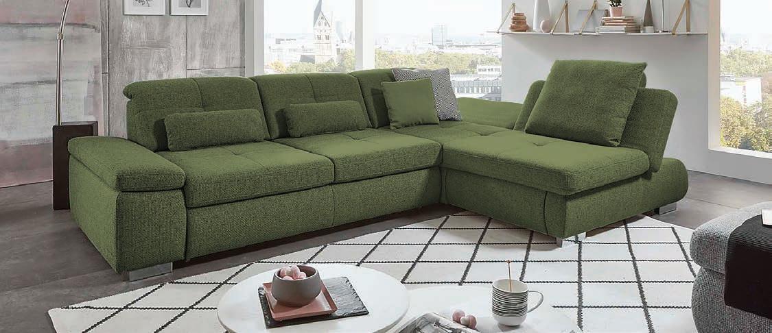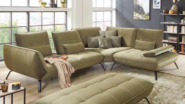 Polstergarnitur, Bezug Nemo moos, Metallfüße glänzend, Kaltschaum-Polsterung auf Wellenfedern, Stellmaß ca. 293x218 cm. Ohne Nierenkissen, Dekokissen und Deko. 11610026/99