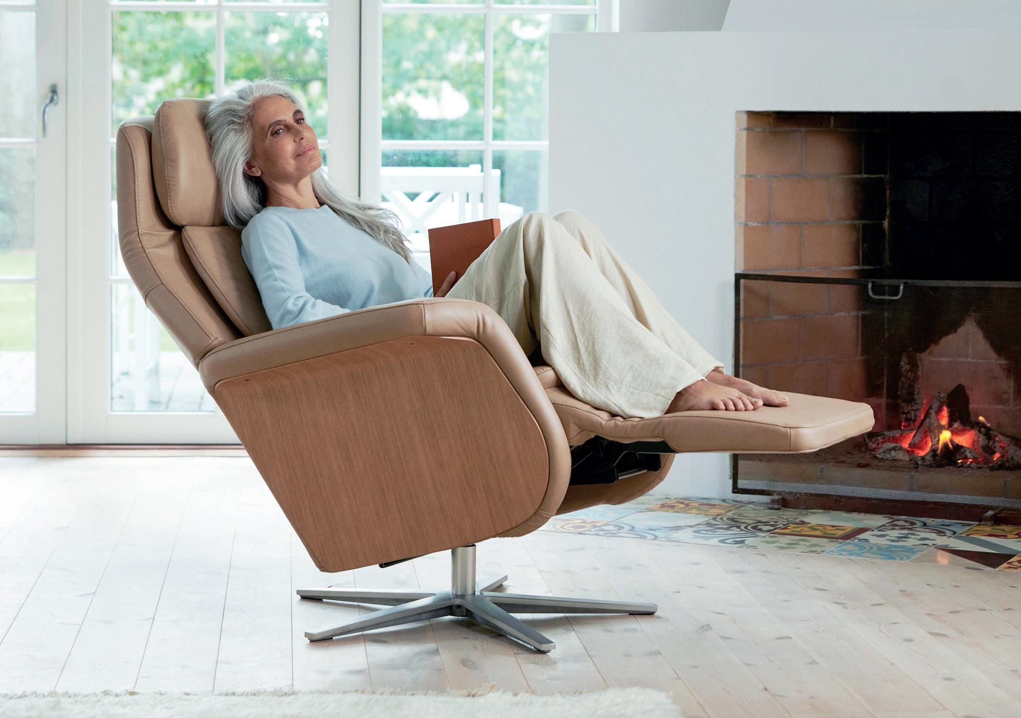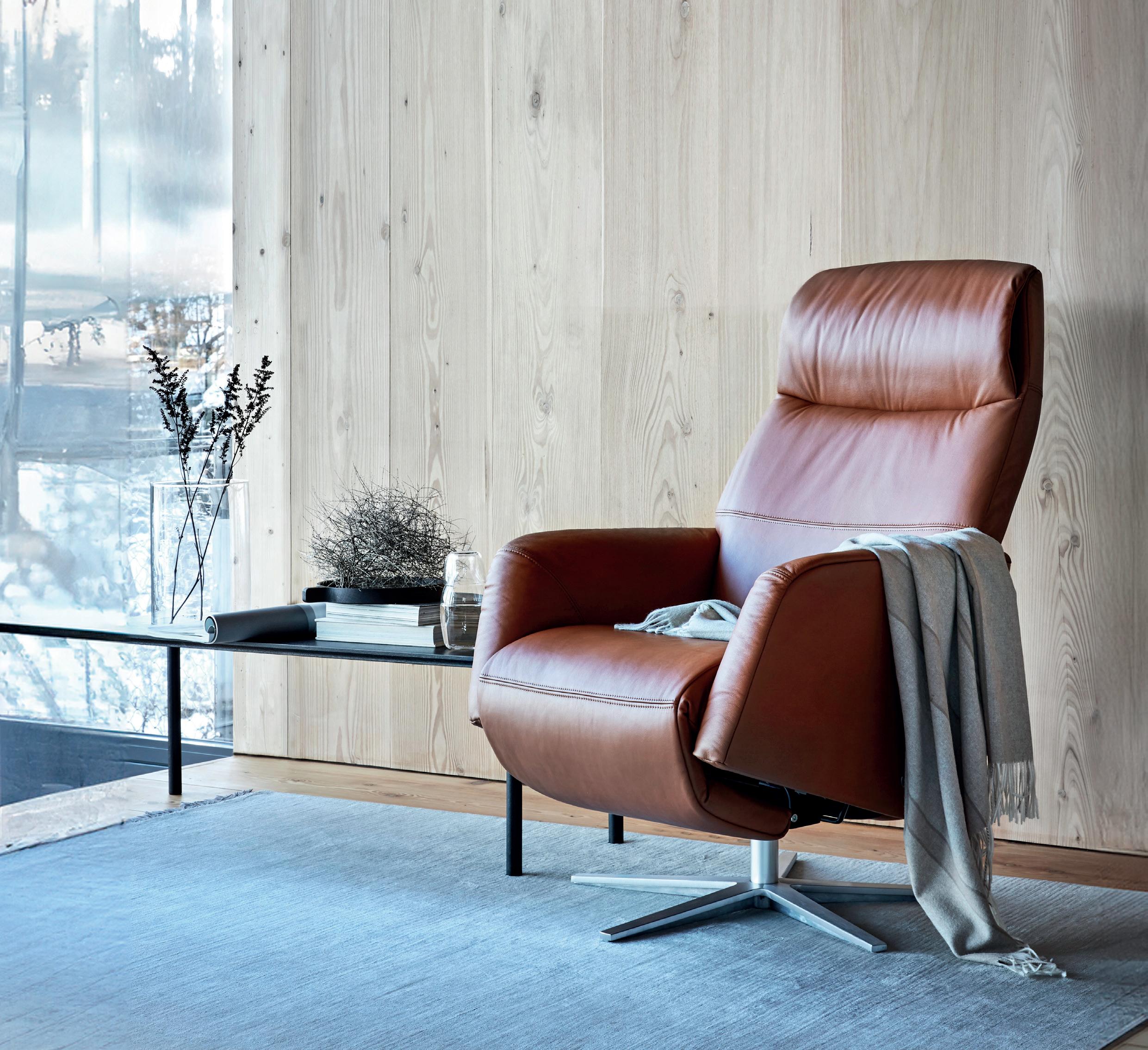 Alle Komfortfunktionen und Bewegungen sind motorisiert, synchronisiert und einzeln verstellbar. Der Sessel ist mit zwei verschiedenen Untergestellen erhältlich.