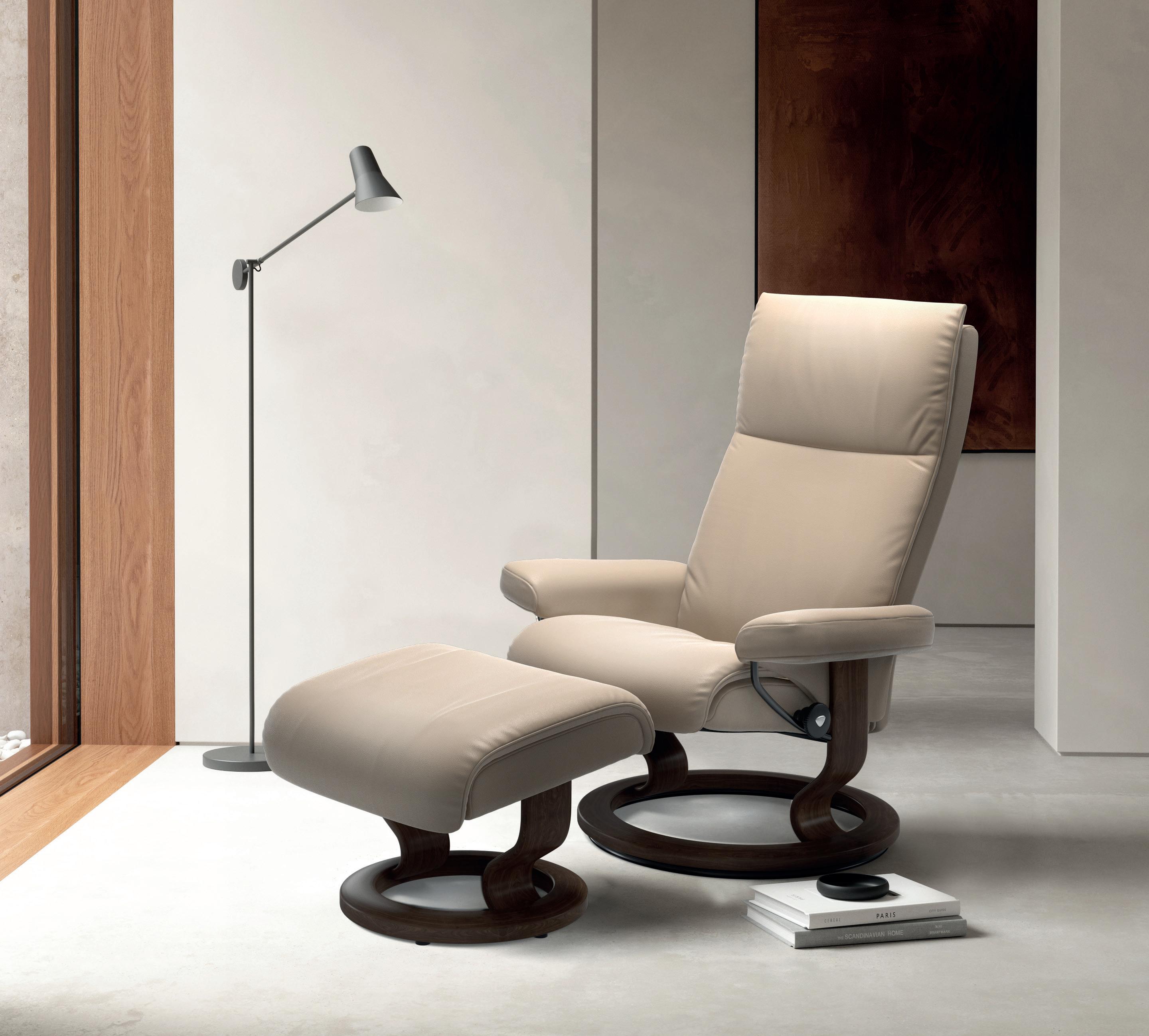Stressless® Aura inkl. Hocker mit Classic Untergestell in den Größen (S/M/L) in folgenden farben in Leder „Paloma“ erhältlich: New Cognac/Sand/Chocolate/Black