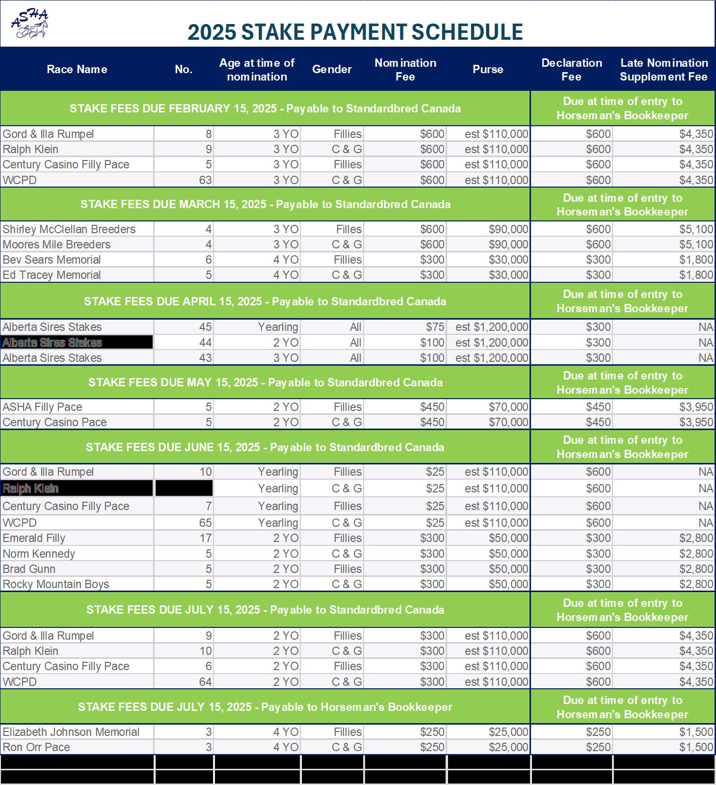 For foals of 2022 (three-year-olds in 2025) sired by a stallion registered with the Alberta Standardbred Horse Association Sires Stakes program and standing in Alberta for the entire year of breeding Foals must be nominated in their yearling year and sustaining payments made in their two- and three-year-old years to remain eligible.