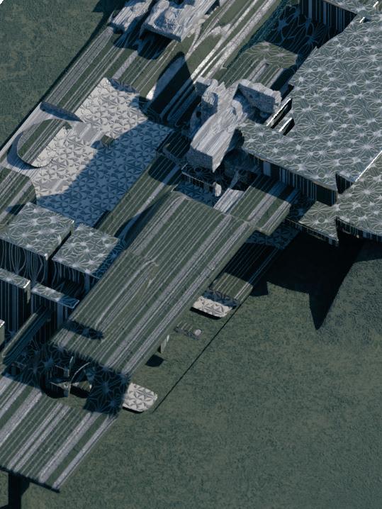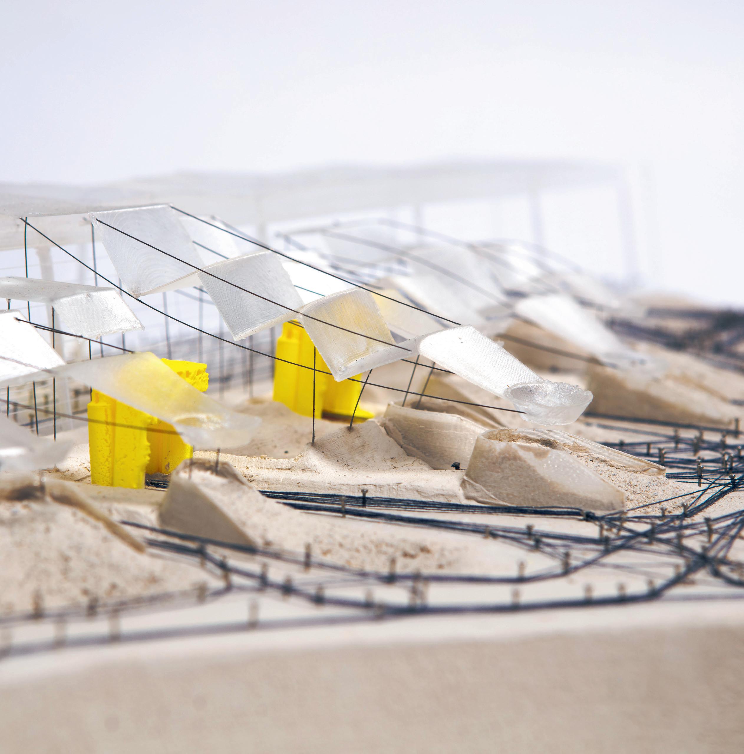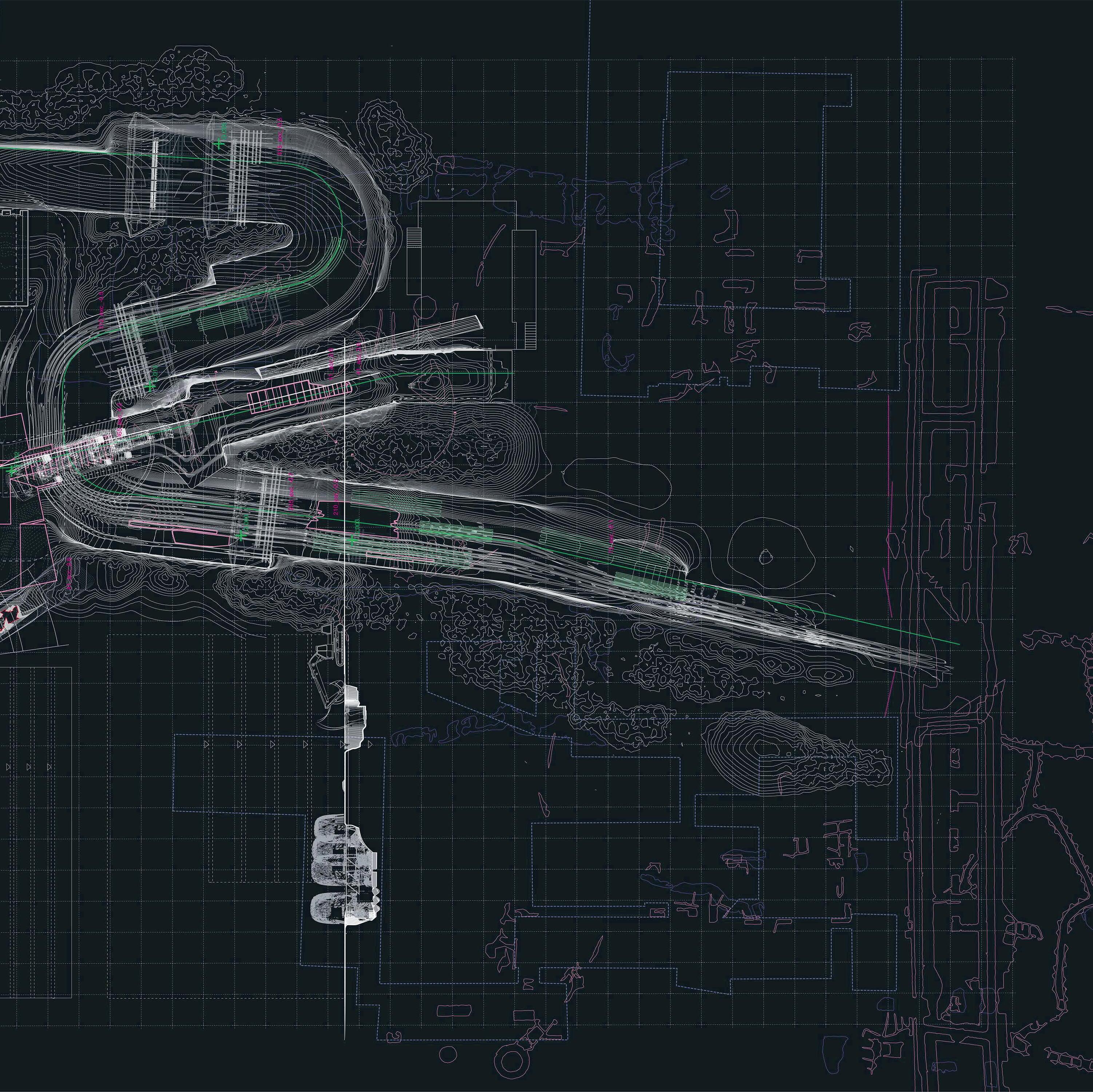 space, by hybridizing different programs in vacant spaces between warehouses through roof modules, earthworks, and paths of humans and machines. The drawings and models show different studies of world-making within infrastructure space. In order to design in the world of infrastructure, the various elements must be read, reproduced, and further developed, following their own logic. The logic becomes the medium of the design development.