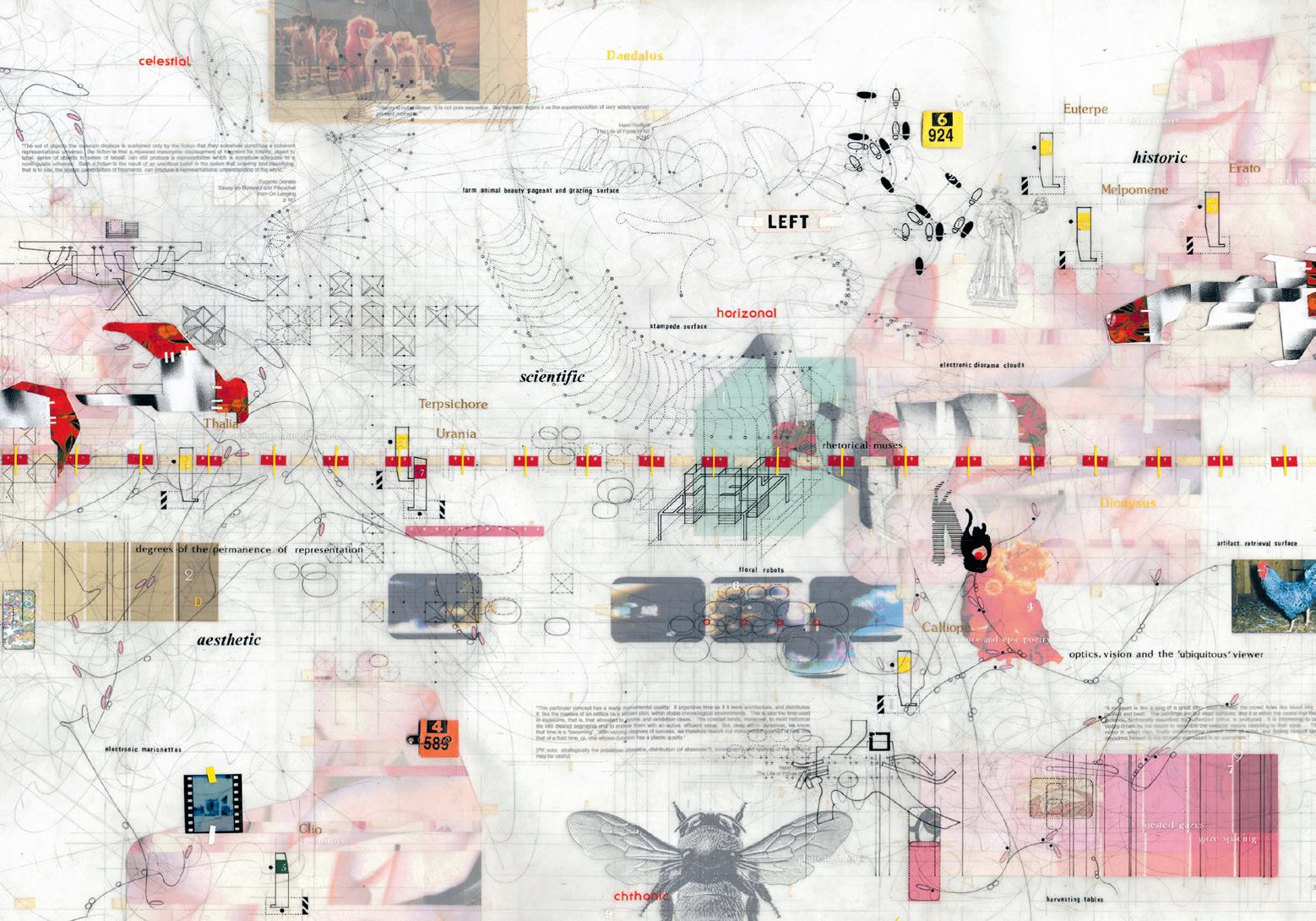There are huge differences between the physicality of working on a drawing like the David’s Island Strategic Plot. That’s a 125-hour drawing – technically, not to do with the thinking. There are six layers in it. There are animal x-rays, aluminum foil and cut paper pieces, drawn things, press-type letters that go on one letter at a time, and so on. The latent and tacit knowledge, which is gained by that means of working, can contribute significantly in relation to keyboard commands. But the keyboard has huge potential. The digital world is phenomenally interesting. I think we’re touching 3, 4, 5% of what digitality can allow
