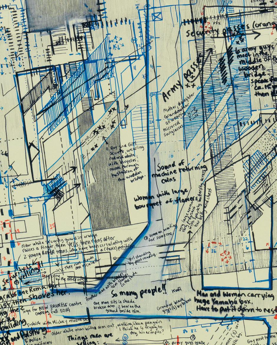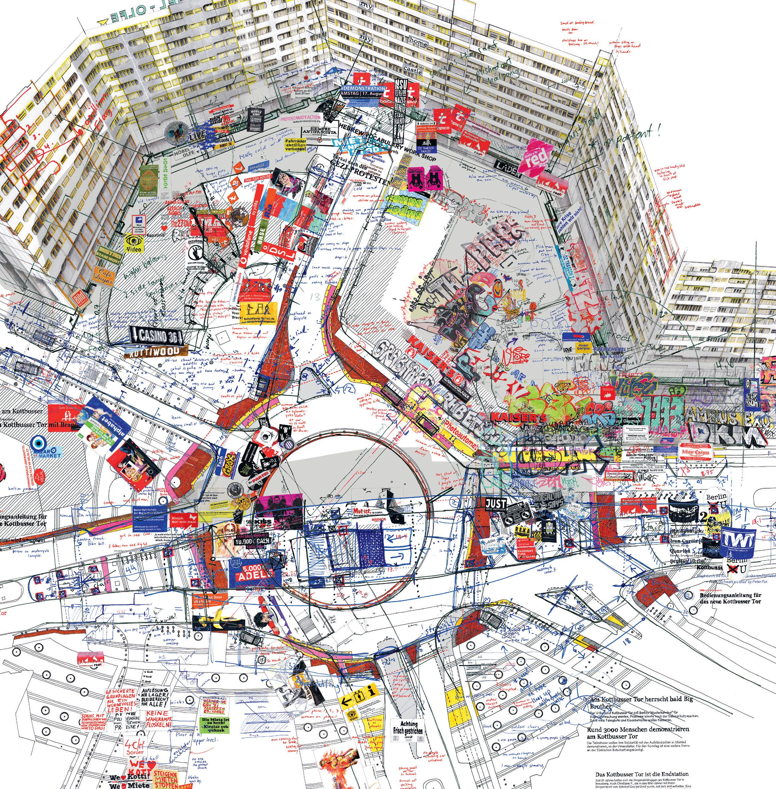 I think that some of the differences simply come from being an artist. The 2008 piece is very dense, while in 2010, I wanted to try something different and to make a more reduced piece. The 2010 piece addresses accessibility and the shape of the built environment and it doesn’t have any notes, graffiti, or text on it. The 2014 piece, on the other hand, is again dense. The site changed. A new mosque was being built. There was more cultural and social activity happening, and even more text covered Kotti’s surfaces, so the final drawing shifted once again.