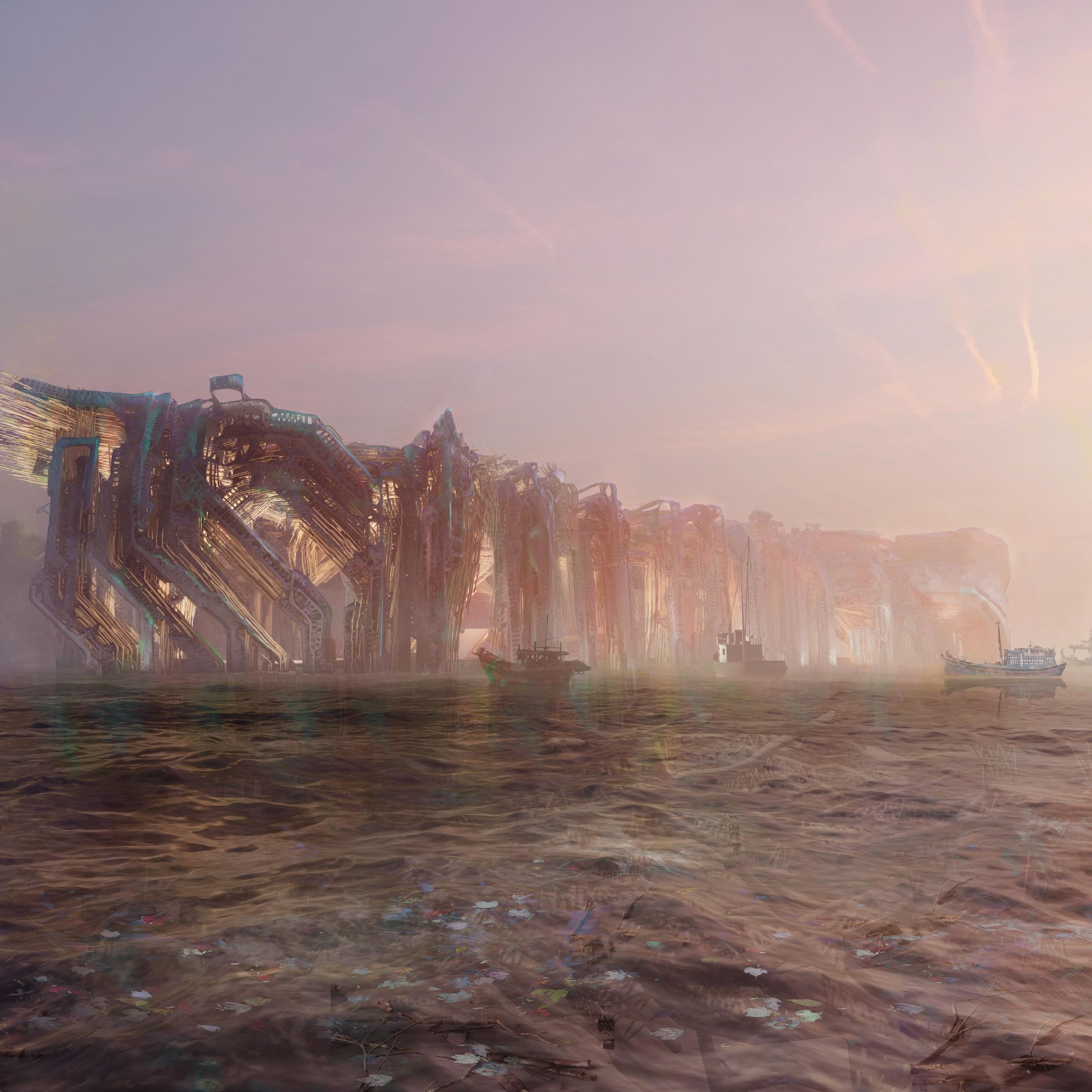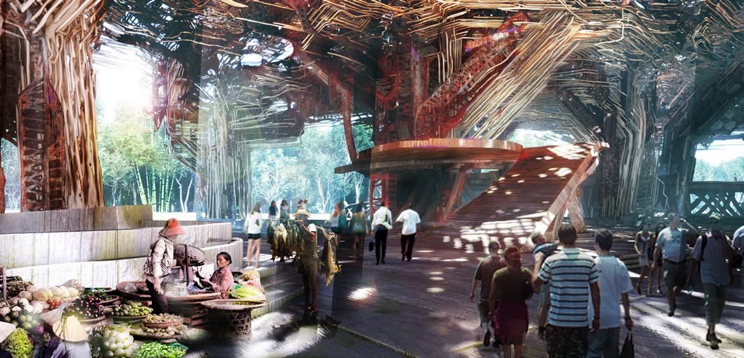 This project establishes a floating market typology and a prototypical landscape master plan within the Mekong Delta in Vietnam. One of the most agriculturally productive and biodiverse eco-regions in the entire world, this area has been destabilized by aggressive hydroelectric development and industrial aquaculture farming and deforestation. This master plan attempts to sustain and grow the geological and biological complexity of its surroundings. It positively interferes with other cohabitants through productive manipulations of neighboring and overarching processes: sediment accumulation from the river, sea waves impacting on the coast, and a dense network of mangrove forests stabilizing the dynamic soil.