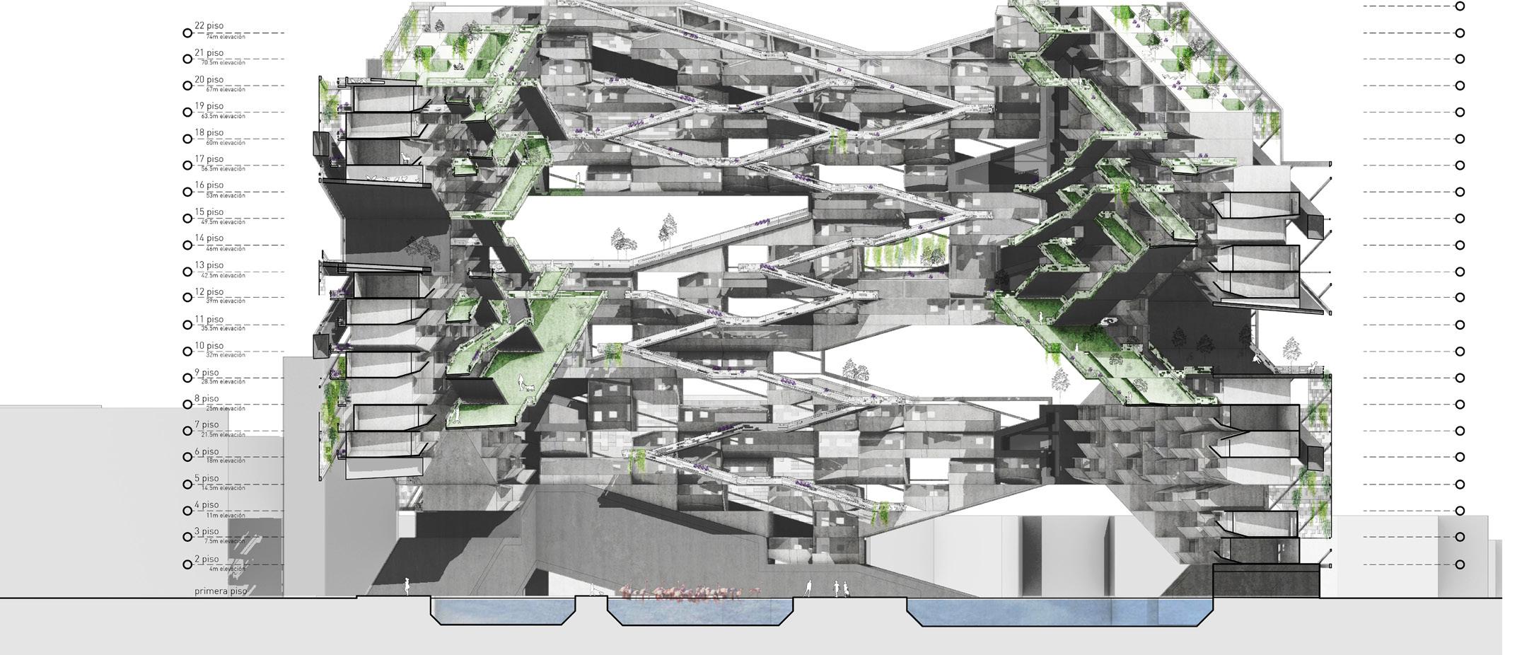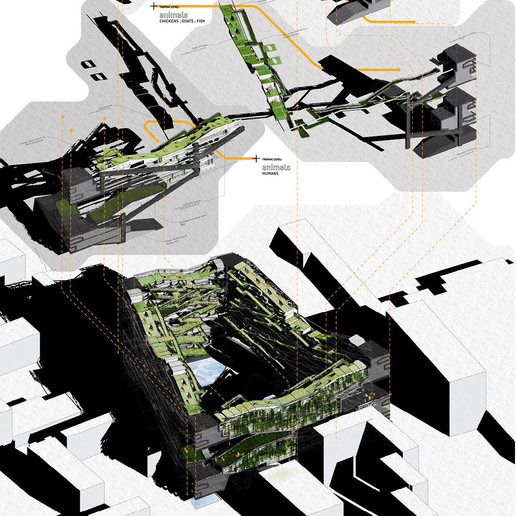 We sought to develop a new typology which is a 50/50 blend of a high-density, urban, mixed-use landscape and a rural agricultural landscape. We proposed a radical interpretation of amenities typically associated with large-scale residential towers. The tower, thin and porous, is wrapped in an artificial landscape, creating an interconnected ground condition on every level. This ground, highly coveted free space in the city, presents opportunities for parking spaces and urban agriculture. In this manner, the form of the building responds to and creates affordances for multispecies cohabitation, presenting an alternative model of urban density and public space.