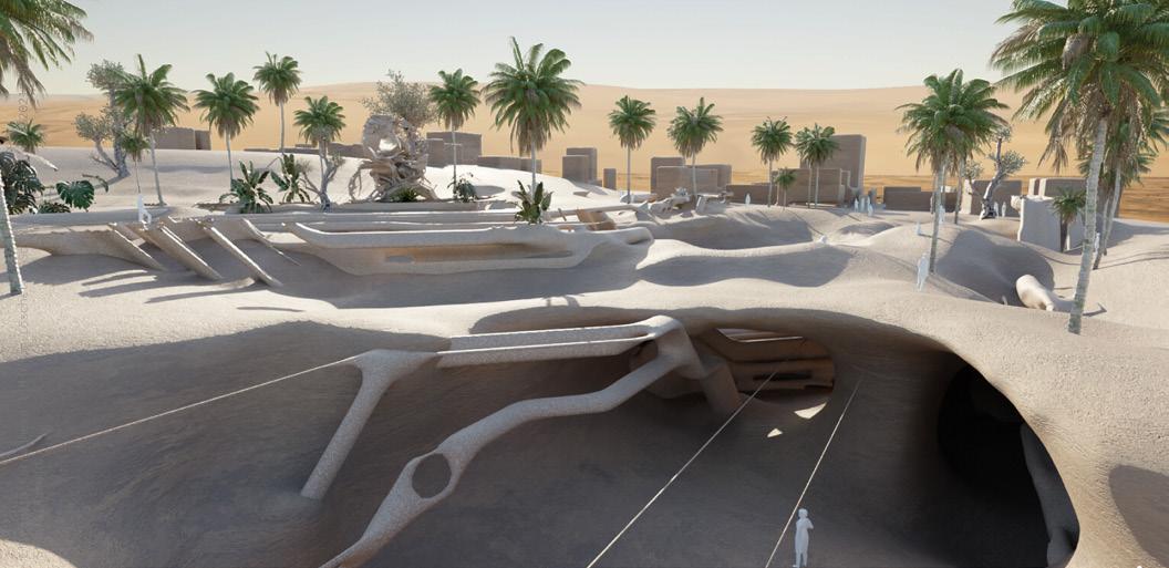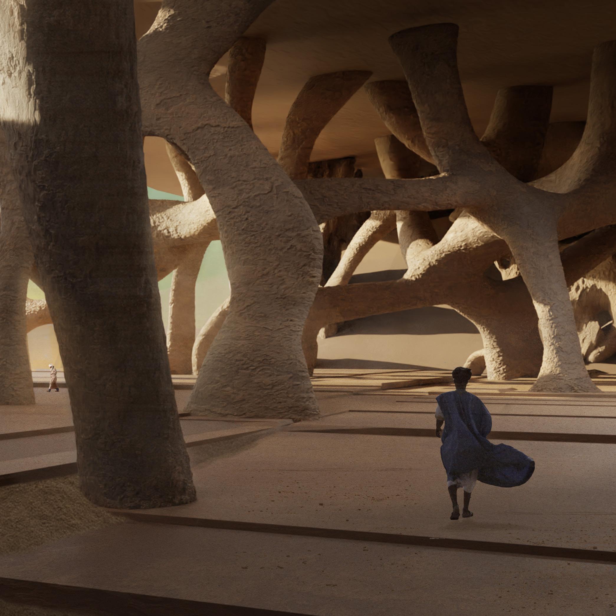 Considering the problem of desertification as a point of departure, this project is not about fighting climate change, but instead about learning how to coexist with it and use it as a driving factor. With the use of solidified sand, the dune barrier is preserving the city from the Sahara, while creating recreational areas, which are semi-shaded, as is the architectural tradition of the region. Providing a shelter from wind, sun and sand, a pathway alongside the border with the desert is the perfect place for leisure activities. By storing and directing the water available from the annual flood of the river, the water system helps the irrigation and greeneries. Condensators are low-tech devices located in the irrigation areas which utilize the water cycle and grow mycelium-bound shading structures in the rainy season from desert shaggy mane mushrooms. While drying the final product, water is condensated and brought back to the vegetation. These systems work together and try to not only ensure a more pleasant environment for humans, but also to stop (and hopefully reverse) the negative impact of the current climatic situation in desert regions.