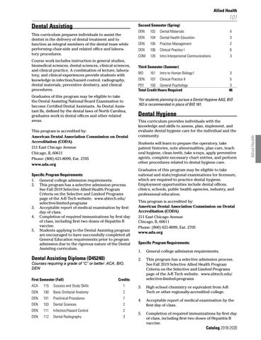 Course work includes instruction in general studies, biomedical sciences, dental sciences, clinical sciences, and clinical practice. A combination of lecture, laboratory, and clinical experiences provide students with knowledge in infection/hazard control, radiography, dental materials, preventive dentistry, and clinical procedures. Graduates of this program may be eligible to take the Dental Assisting National Board Examination to become Certified Dental Assistants. As Dental Assistant IIs, defined by the dental laws of North Carolina, graduates work in dental offices and other related areas. This program is accredited by: American Dental Association Commission on Dental Accreditation (CODA) 211 East Chicago Avenue Chicago, IL 60611 Phone: (800) 621-8099, Ext. 2705 www.ada.org Specific Program Requirements: 1. General college admission requirements. 2. This program has a selective admission process. See Fall 2019 Selective Allied Health Program Criteria on the Selective and Limited Programs page of the A-B Tech website. www.abtech.edu/ selective-limited-programs 3. Acceptable report of medical examination by first day of class. 4. Completion of required immunizations by first day of class, including first two doses of Hepatitis B vaccine. 5. Students applying to the Dental Assisting program are encouraged to have successfully completed all General Education requirements prior to program admission due to the rigorous nature of the Dental Assisting curriculum.