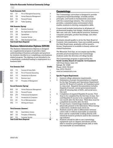 Cosmetology The Cosmetology curriculum is designed to provide competency-based knowledge, scientific/artistic principles, and hands-on fundamentals associated with the cosmetology industry. The curriculum provides a simulated salon environment which enables students to develop manipulative skills. Course work includes instruction in all phases of professional imaging, hair design, chemical processes, skin care, nail care, multi-cultural practices, business/ computer principles, product knowledge, and other selected topics. Graduates should qualify to sit for the State Board of Cosmetic Arts examination. Upon successfully passing the State Board exam, graduates will be issued a license. Employment is available in beauty salons and related businesses. The Mountain Tech Spa, an on-campus spa facility, provides practical experience for Cosmetology students under the direction of College faculty. The Cosmetology program is approved by the: North Carolina Board of Cosmetic Art Examiners 1207 Front Street, Suite 110 Raleigh, NC 27609 Phone: (919) 733-4117 Fax: (919) 733-4127 www.nccosmeticarts.com Specific Program Requirements 1. General college admission requirements. 2. Submission of proper documentation is required by the Spa Therapies and Operations Department and the NC Board of Cosmetic Art Examiners prior to class start. Required documentation includes Hepatitis B record, current government-issued photo ID showing date of birth, and social security card. 3. Completion of required Hepatitis B vaccine. First dose to be completed by the first day of class. Second Hepatitis B vaccine to be completed at least one month after the first dose. Third dose must be completed six months after the first. 4. To earn hours, Cosmetology students must be physically present in the laboratory. When leaving a laboratory, students must clock out. 5. Students must be able to differentiate between colors with or without reasonable accommodations and be comfortable working directly with chemicals found in products used in the cosmetology industry 6. Students should be able to use cosmetology equipment such as clippers and shears and be able to stand for prolonged periods with or without reasonable accommodations.