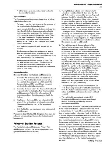 1. The right to inspect and review the student’s education records within 45 days after the day A-B Tech receives a request for access. Any such requests should be submitted in writing to the Records and Registration Office, either by email to registrar@abtech.edu or by hand-delivering or mailing a letter to: Records and Registration, K. Ray Bailey Student Services Building, 340 Victoria Rd., Asheville, NC 28801. The written request must identify the record(s) the student wishes to inspect. The Registrar will make arrangements for access and notify the student of the time and place where the records may be inspected. If the records are not maintained by the Registrar, the Registrar shall advise the student of the correct official to whom the request should be addressed. 2. The right to request the amendment of the student’s education records that the student believes is inaccurate, misleading, or otherwise in violation of the student’s privacy rights under FERPA. Any such requests should be submitted in writing to Records and Registration, either by email to registrar@abtech.edu or by hand-delivering or mailing a letter to: Records and Registration, K. Ray Bailey Student Services Building, 340 Victoria Rd., Asheville, NC 28801. The written request must identify the part(s) of the record the student wants changed, and specify why it should be changed. If A-B Tech decides not to amend the record as requested, A-B Tech will notify the student in writing of the decision and the student’s right to a hearing regarding the request for amendment. Additional information regarding the hearing procedures will be provided to the student when notified of the right to a hearing. 3. The right to provide written consent before A-B Tech discloses personally-identifiable information from the student’s education records, except to the extent that FERPA authorizes disclosure without consent. 4. The right to file a complaint with the U.S. Department of Education concerning alleged failures by A-B Tech to comply with the requirements of FERPA. As a general rule, a student’s parents/guardians do not have access to a student’s education records. When a student turns 18 years old or enrolls at an institution of postsecondary education (such as A-B Tech), a student’s rights under FERPA transfer from the parent to the student. In order for parents to have access to a student’s education records, beyond Directory Information and without written permission from the student, a parent must certify that the student is economically dependent as defined in Section 152 of the Internal Revenue Code of 1986. If a parent can prove dependency to the Records and Registration Office by showing a copy of the parent’s most recent tax return or other acceptable documentation, then the parent may have full access to the student’s education records. Catalog 2019-2020