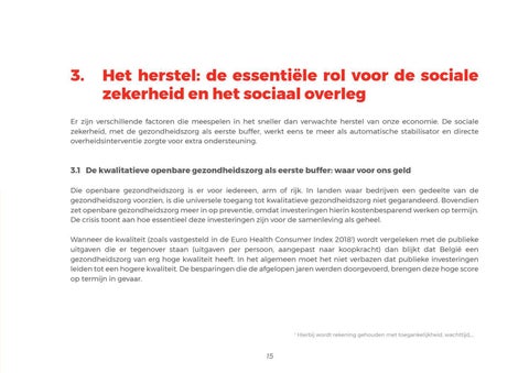 3.1 De kwalitatieve openbare gezondheidszorg als eerste buffer: waar voor ons geld Die openbare gezondheidszorg is er voor iedereen, arm of rijk. In landen waar bedrijven een gedeelte van de gezondheidszorg voorzien, is die universele toegang tot kwalitatieve gezondheidszorg niet gegarandeerd. Bovendien zet openbare gezondheidszorg meer in op preventie, omdat investeringen hierin kostenbesparend werken op termijn. De crisis toont aan hoe essentieel deze investeringen zijn voor de samenleving als geheel. Wanneer de kwaliteit (zoals vastgesteld in de Euro Health Consumer Index 20181) wordt vergeleken met de publieke uitgaven die er tegenover staan (uitgaven per persoon, aangepast naar koopkracht) dan blijkt dat België een gezondheidszorg van erg hoge kwaliteit heeft. In het algemeen moet het niet verbazen dat publieke investeringen leiden tot een hogere kwaliteit. De besparingen die de afgelopen jaren werden doorgevoerd, brengen deze hoge score op termijn in gevaar.