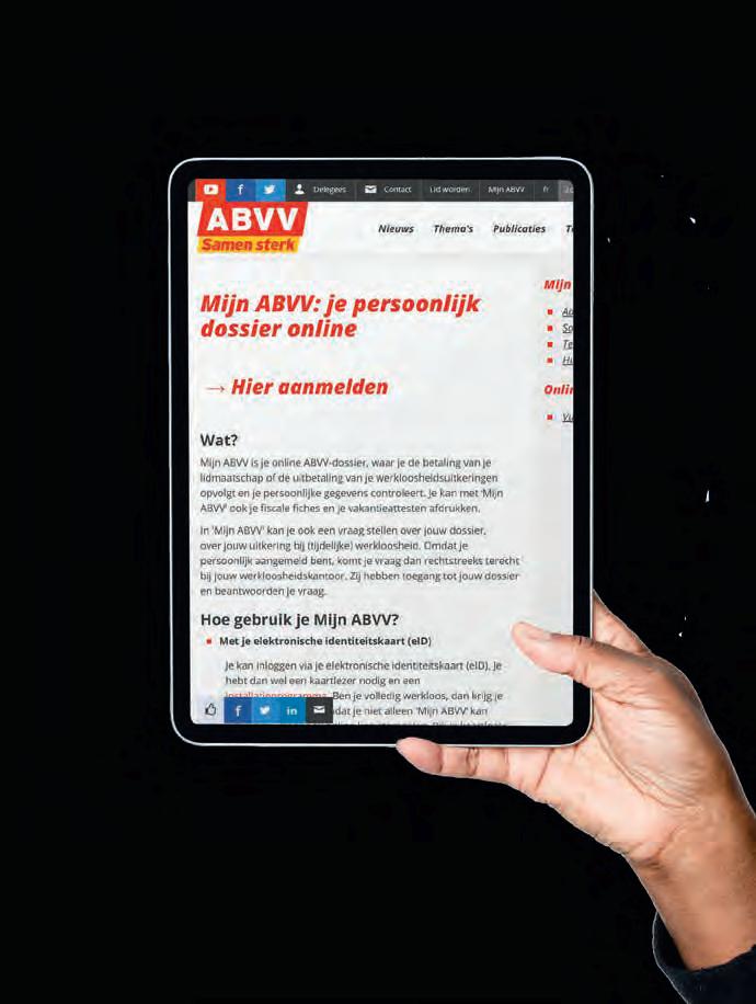 MIJN ABVV is een exclusieve dienst voor ABVV-leden. Je vindt er alle informatie over jouw lidmaatschap en eventueel jouw werkloosheidsdossier. Je kunt zelf gegevens aanpassen, eventueel aanvragen (tijdelijke) werkloosheid doen, documenten opvragen en rechtstreeks vragen stellen aan de dienstverleners van het ABVV.