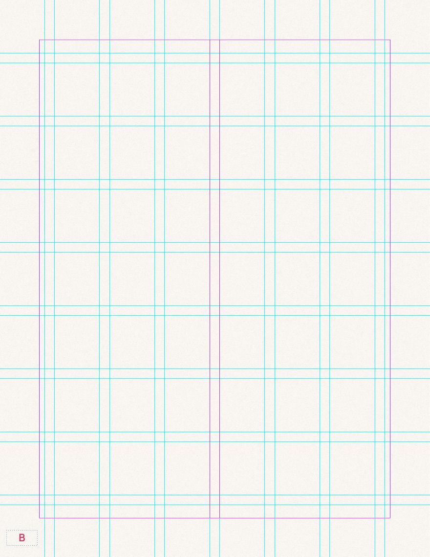 Compuesta por una retícula de 8 columnas y 9 filas con un medianil de 5 mm. Todas las páginas tienen márgenes establecidos a 2cm de cada lado. Y su corte es de tamaño carta 21.59 cm x 27.94 cm.
