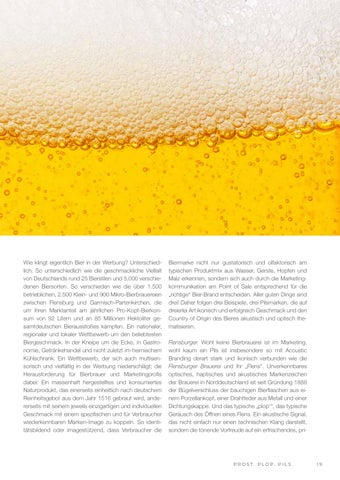 Wie klingt eigentlich Bier in der Werbung? Unterschiedlich. So unterschiedlich wie die geschmackliche Vielfalt von Deutschlands rund 25 Bierstilen und 5.000 verschiedenen Biersorten. So verschieden wie die über 1.500 betrieblichen, 2.500 Klein- und 900 Mikro-Bierbrauereien zwischen Flensburg und Garmisch-Partenkirchen, die um ihren Marktanteil am jährlichen Pro-Kopf-Bierkonsum von 92 Litern und an 85 Millionen Hektoliter gesamtdeutschen Bierausstoßes kämpfen. Ein nationaler, regionaler und lokaler Wettbewerb um den beliebtesten Biergeschmack. In der Kneipe um die Ecke, in Gastronomie, Getränkehandel und nicht zuletzt im heimischem Kühlschrank. Ein Wettbewerb, der sich auch multisensorisch und vielfältig in der Werbung niederschlägt; die Herausforderung für Bierbrauer und Marketingprofis