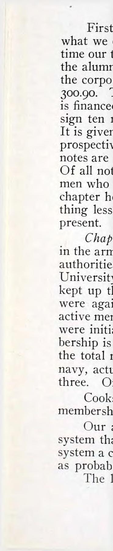 FINANCE Prior to th e War Co nfer en ce h eld in Chicago, May JI , I9I8 , Brother H. L. Brown, then Grand Pres id e nt , in stru c ted the Gra nd to co llec t a ll obligations due the G r a nd Fraternity if humanly possible. a ?f a.n extra effort along thi s lin e , all chapters excep t fo':lr had. paid the1r and .two of th e d e linqu ent on es had partia ll y pa;d th eir s by th e tJm e me e tmg was. h eld .. Since that time, many ch ap t e r s h ave become delmquent, not only m th e1r finan ce s, but al s o in reporting th e .numb e r of men initiat ed and th e pre capita ta x du e. In a f ew mstances, pms have been ordered a nd d eli vered wit h ou t pa y m e nt for same being made.