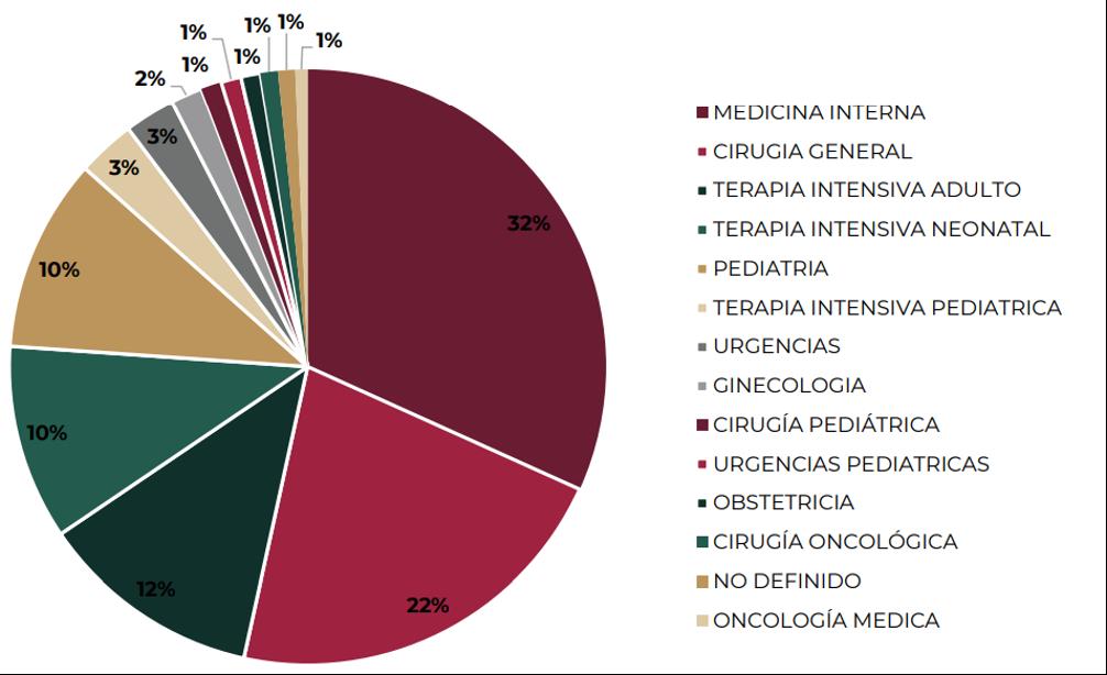 Por otro lado, en relación con los servicios clínicos, la notificación se realiza en primer lugar en Medicina Interna, Seguido de Cirugía General y las Terapias Intensivas.