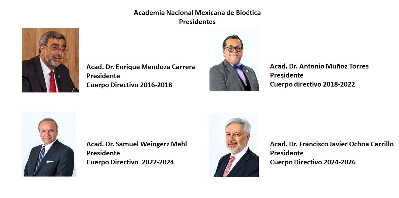 Acad. Dr. Manuel Velasco Suárez †, Presidente Fundador. Cuerpo Directivo 1995- 2002.; Acad. Dr. Luis Limón Limón, Presidente, Cuerpo Directivo 2002-2004; Acad. Dr. Horacio García Romero †, Presidente Cuerpo Directivo 2004-2006; Acad. Dr. José Torres Mejía, Presidente. Cuerpo Directivo 20062008; Acad.Dr. Octaviano Humberto Domínguez Márquez †, Presidente. Cuerpo Directivo 2008-2010.; Acad. Dra. María de la Luz Casas Martínez, Presidente. Cuerpo Directivo 20102012.; Acad. Dra. María Cristina Caballero Velarde, Presidente. Cuerpo Directivo 2012- 2014.; Acad, Dra. Martha Tarasco Michel, Presidente. Cuerpo Directivo 2014-2016.; Acad. Dr. Enrique Mendoza Carrera, Presidente. Cuerpo Directivo 20162018.: Acad. Dr. Antonio Muñoz Torres; Presidente. Cuerpo Directivo 2018-2022.; Acad. Dr. Samuel Weingerz Mehl, Presidente. Cuerpo Directivo 2022-2024.