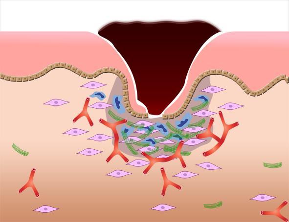 O tecido destruído é substituído pelo chamado tecido de granulação, que preenche a ferida desde o seu interior.