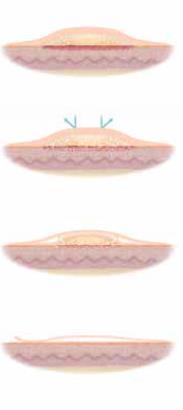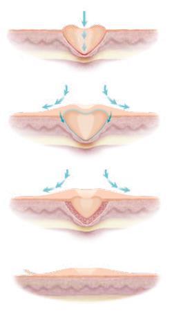 Divisão de células epiteliais da camada superficial da pele + contração da ferida > as extremidades da ferida são unidas até ao seu fecho total > uma vez substituída a pele, a crosta que a cobre cai, revelando a nova pele.
