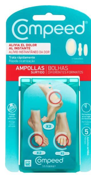 COMPEED® bolhas Se for diabético, consulte o seu médico antes de utilizar Não aplique sobre feridas infetadas Nunca corte ou reutilize o penso Se a bolha piorar ou não cicatrizar, pare de utilizar o produto e consulte um médico. COMPEED® calosidades. Se for diabético, consulte o seu médico antes de utilizar. Não aplique sobre feridas infetadas. Nunca corte ou reutilize o penso. COMPEED® calos. Se for diabético, consulte o seu médico antes de utilizar. Não aplique sobre feridas infetadas. Nunca corte ou reutilize o penso. COMPEED® joanetes. Se for diabético, consulte o seu médico antes de utilizar. Não aplique sobre feridas infetadas. Nunca corte ou reutilize o penso. Os pensos COMPEED® acima mencionados são dispositivos médicos. O COMPEED® stick anti-bolhas é um produto cosmético. Não utilize em bolhas já formadas ou feridas. Leia cuidadosamente a rotulagem e as instruções de utilização. Perrigo® Portugal, Lda., World Trade Center Lisboa, Av. Vitor Figueiredo nº4-J piso 1B, 2790255 Carnaxide, NIF: 506 112 233. Data 02/2025.