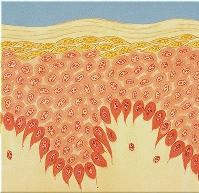 Migração ascendente de queratinócitos para a camada córnea, que apenas contém células mortas.