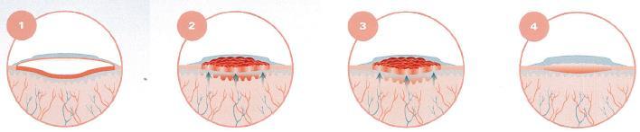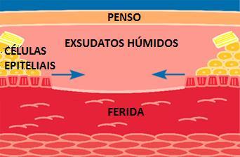 *Exsudato permite uma cicatrização ótima: isto deve-se à sua composição, uma vez que contém vários elementos que mantêm um ambiente favorável à actividade de cicatrização dos fibroblastos. Também garante a manutenção de condições húmidas, o que favorece a migração de queratinócitos, a divisão celular e a síntese de colagénio do meio extracelular A pele