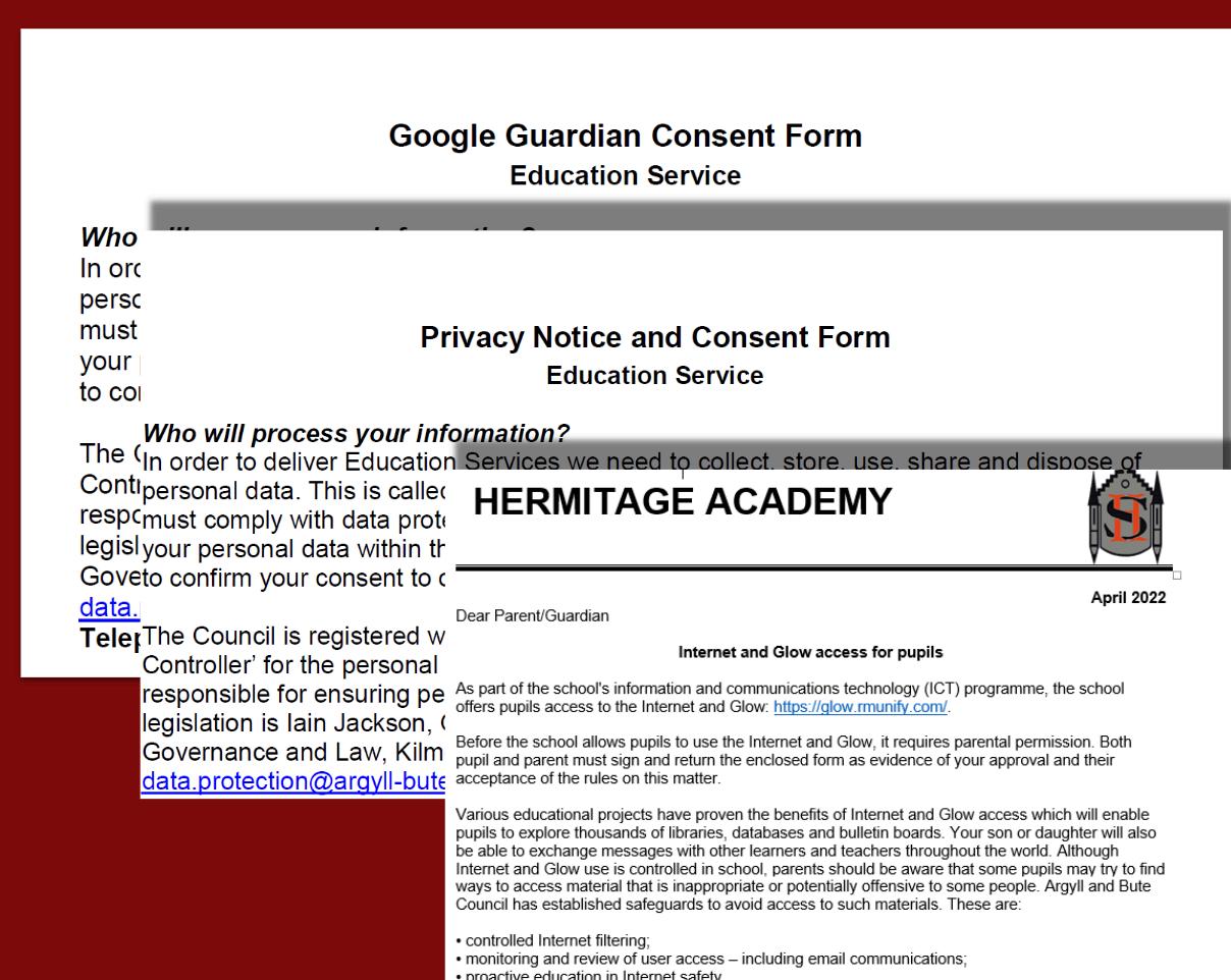 Parent Tab on School Website: http://www.hermitageacademy.argyll-bute.sch.uk/ Parent TAB. Application for school meals and clothing grants: https://www.argyll-bute.gov.uk/education-and-learning/free-school-meals
