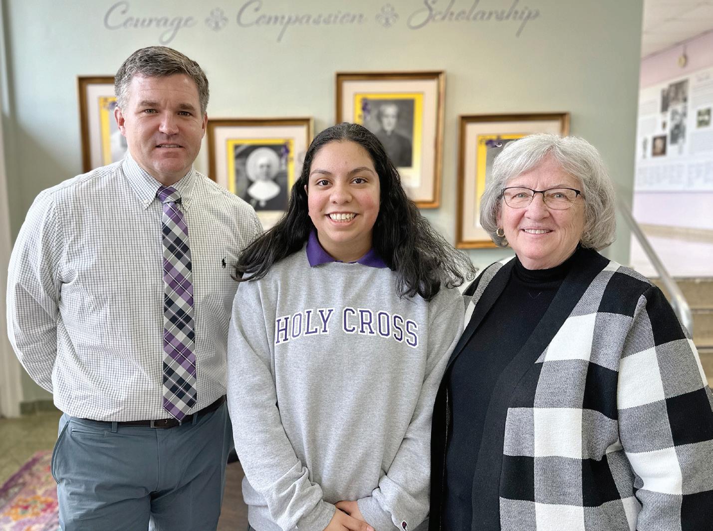 Top: Mme. Aurelie Miller’s husband, Holy Cross students and former Athletic Director Dena Saunders at check presentation on Nov. 8, 2022.