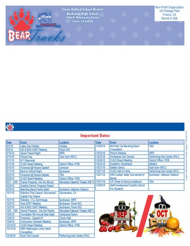 Event Labor Day Holiday ASI & BHS SART Meeting Senior Parent Night Picture Day 9/11 Memorial CUSD Board Meeting Forensics @ Novice Speech Back to School Night Forensics @ Novice Debate CUSD Board Meeting Drama Presents- Into the Woods Grading Period, Progress Report Marching Band Family Night Robotics Post Season Tournament Capital City Classic 10/1/18 Robotics - FLL Scrimmage 10/2/18 Area SART Meeting 10/3/18 ASI & BHS SART Meeting 10/4 - 10/6 Drama Presents - Into the Woods 10/6/18 Foundation 4th Annual Bear Bash 10/6/18 Forensics - Speech #1 10/8/18 Community Outreach Meeting 10/10/18 CUSD Board Meeting 10/13/18 WBA Washington Union Band Competition 10/18/18 Choir Fall Concert