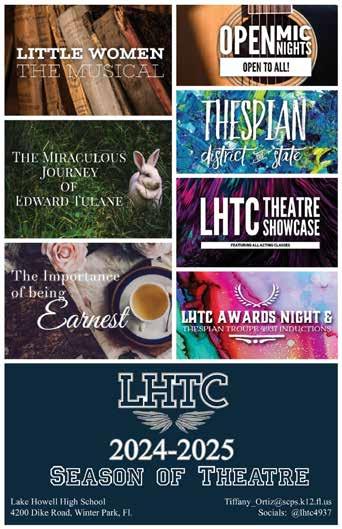 The Lake Howell Theatre Company is gearing up for their Fall Musical: Little Women! Based on Louisa May Alcott’s life, Little Women follows the adventures of sisters Jo, Meg, Beth and Amy March. Jo is trying to sell her stories for publication, but the publishers are not interested – her friend, Professor Bhaer, tells her that she has to do better and write more from herself. Begrudgingly taking this advice, Jo weaves the story of herself and her sisters and their experience growing up in Civil War America. Performance dates are October 24-26 at 7pm and will showcase our performing arts department for the very first time! Please email lhtc4937@gmail.com for more information. If you would like to stay abreast of all thing’s theatre company related, please follow us on Instagram, Twitter, or Facebook @lhtc4937 or check out our website at www. lhtc4937.com!